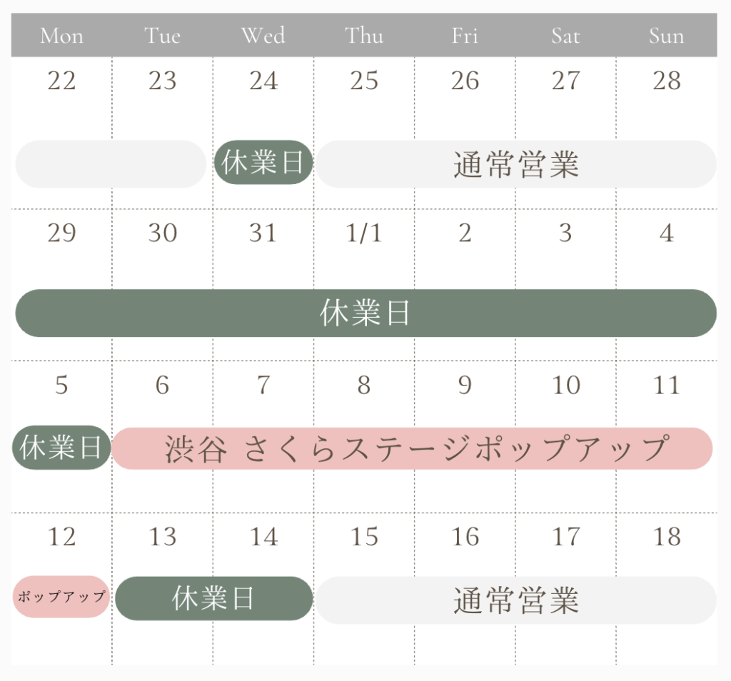 1月6日(火)〜 12日(月) 渋谷さくらステージ ポップアップ出店(16時〜22時)のためお店はお休みです。渋谷さくらステージにぜひお越しください。